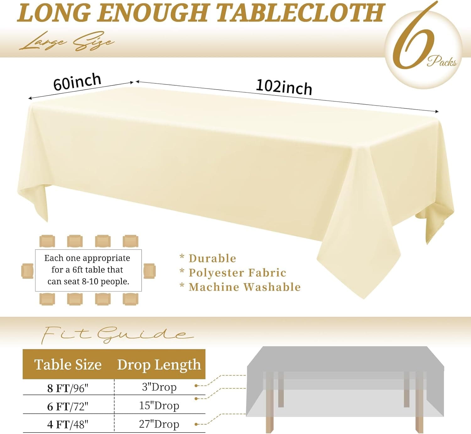 - 🎁 High Quality Polyester Tablecloths: The package includes 6 beige tablecloths made of 180 GSM 100% premium polyester, the table cloths are 120" long and 60" wide, beige tablecloth for 6FT rectangular table. The table cloth covers a 6" table with a 15" drop, this rectangle tablecloth is perfect for protecting and decorating your table.