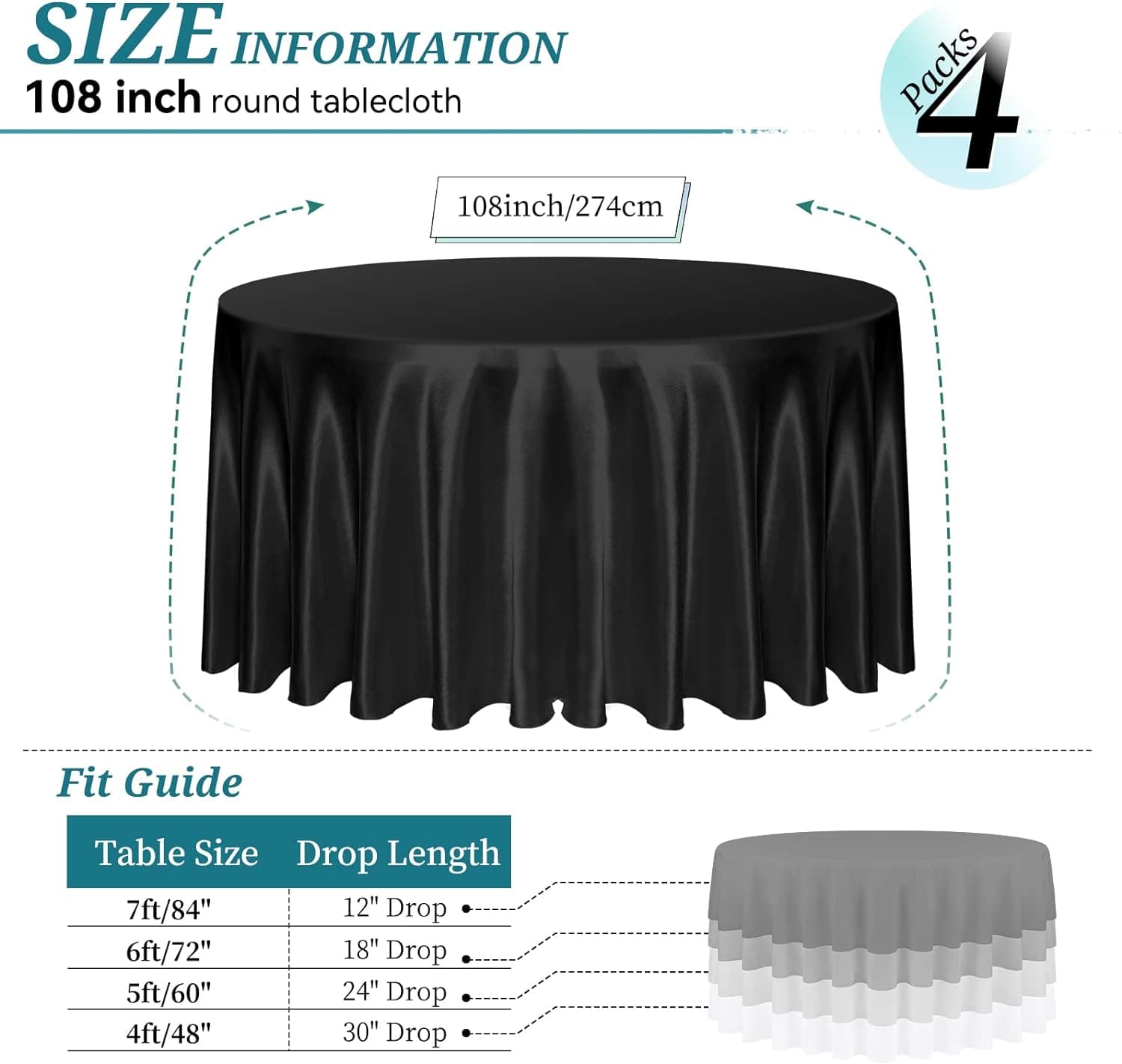 • 🥂【Package Include】You will get 4 pieces black satin tablecloths.The black satin tablecloths are 108inch / 275cm.Premium tablecloth for parties.Suitable for tables of many sizes. Unlike other large size tablecloths, every tablecloth is a complete fabric! The shiny black satin tablecloth makes a nice decorative touch, create an elegant and romantic atmosphere. Great ideal for wedding table decorations for the reception.