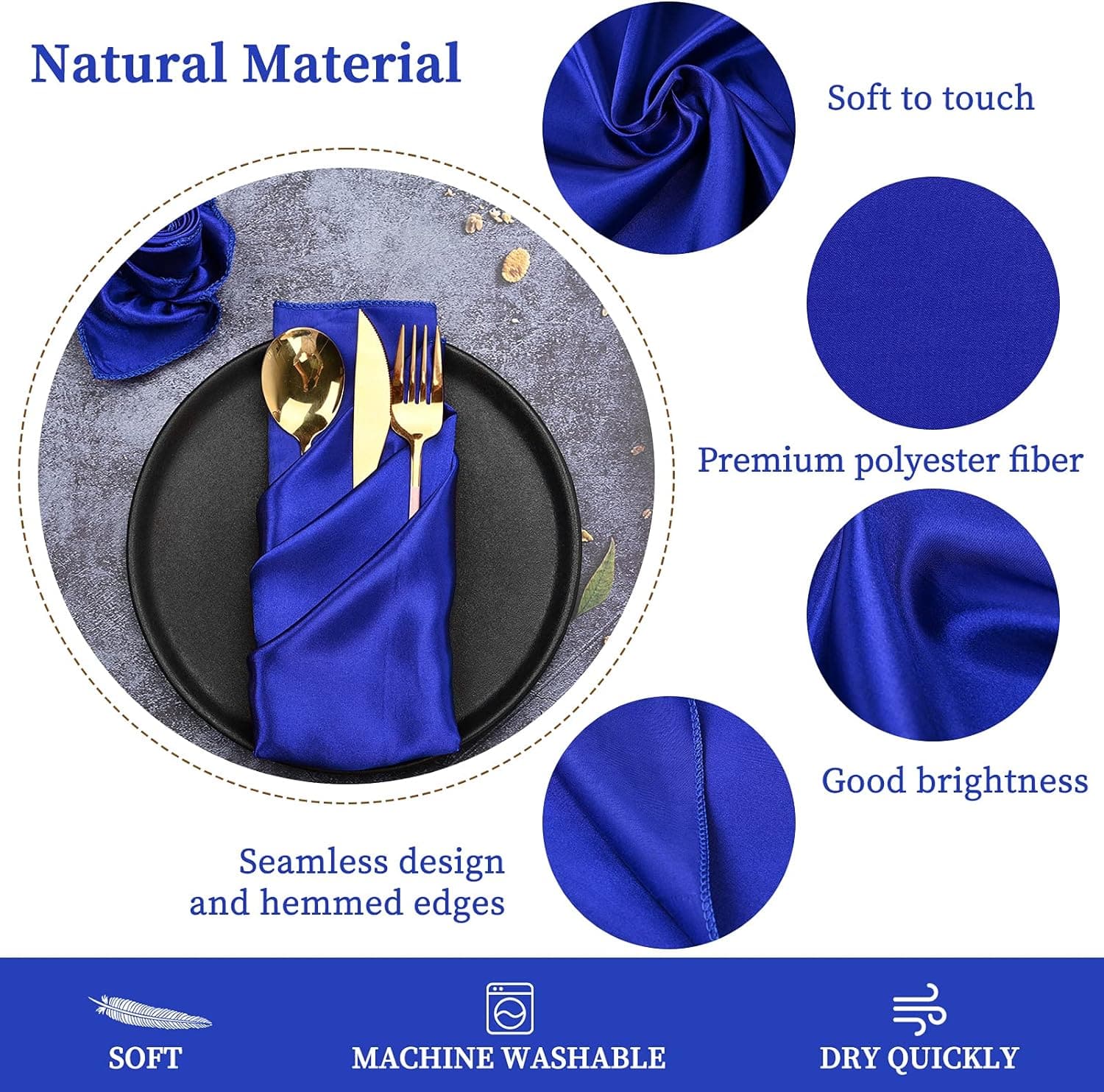 • 🍷【High quality material】The satin napkin is made of satin, very silky and shiny, with soft feeling in hand, smooth and delicate.The stitching on the edge is very fine and neat.The table satin napkin has good brightness and a natural sense of drooping style, not easy to deform,which can meet your needs for a long time, ideal for protecting your table.Washable and reusable, long-lasting dinner napkins require only simple machine-wash care, allowing for repeated use at many different functions.