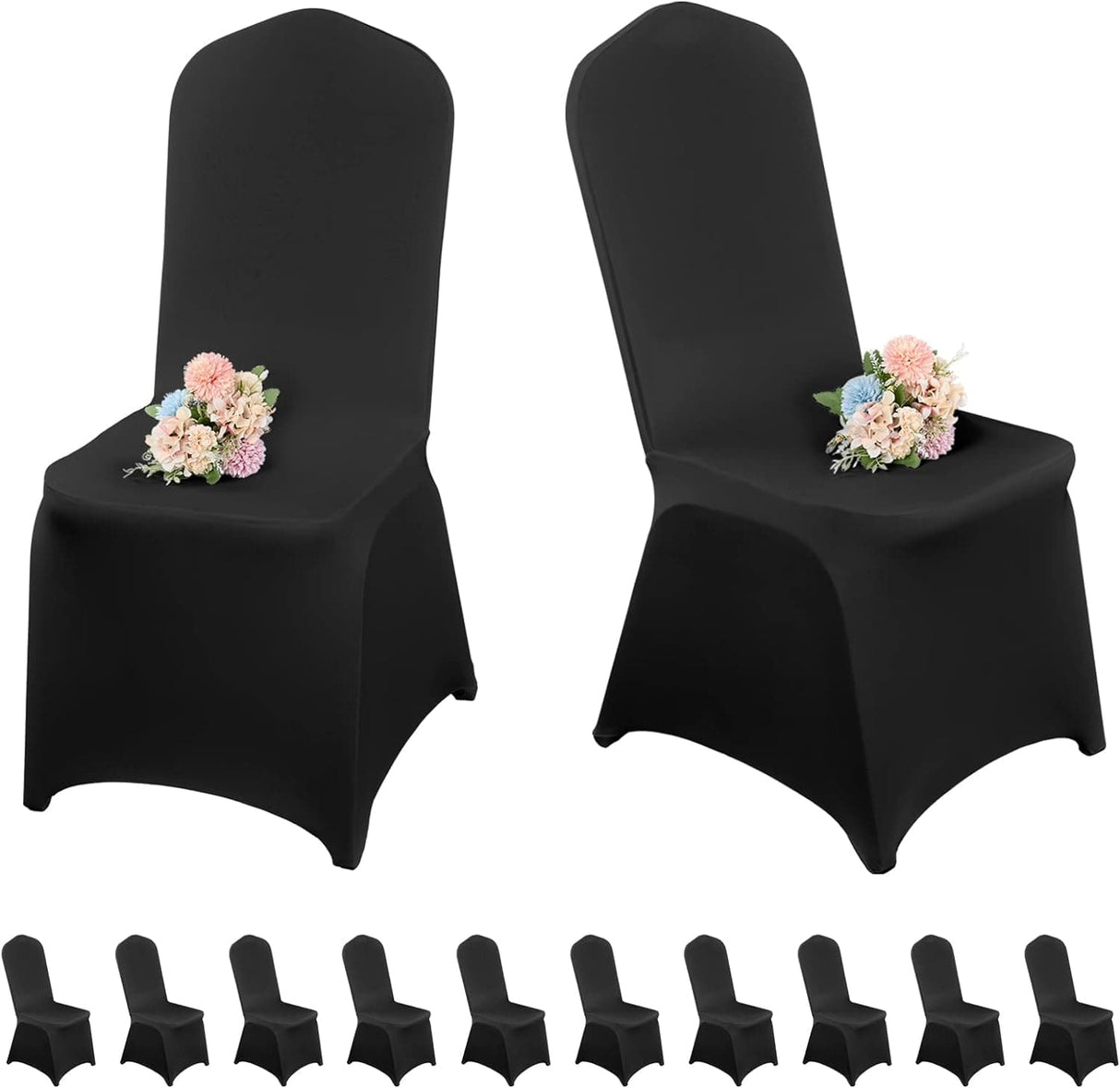 • ★【Set Includes】You will receive 10 packs of black spandex seat covers. Spandex seat covers are made of high quality, extra stretchy and sturdy spandex fabric 170 GSM (about 210 g each) with good stitching, 90% polyester and 10% spandex, which are stretchy, durable, wrinkle-free and stain-resistant, so thicker and more durable than others traditional spandex seat covers. Our spandex seat cover is not transparent, it covers everything and the effect will be very satisfactory.