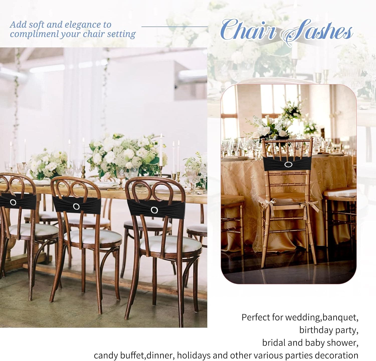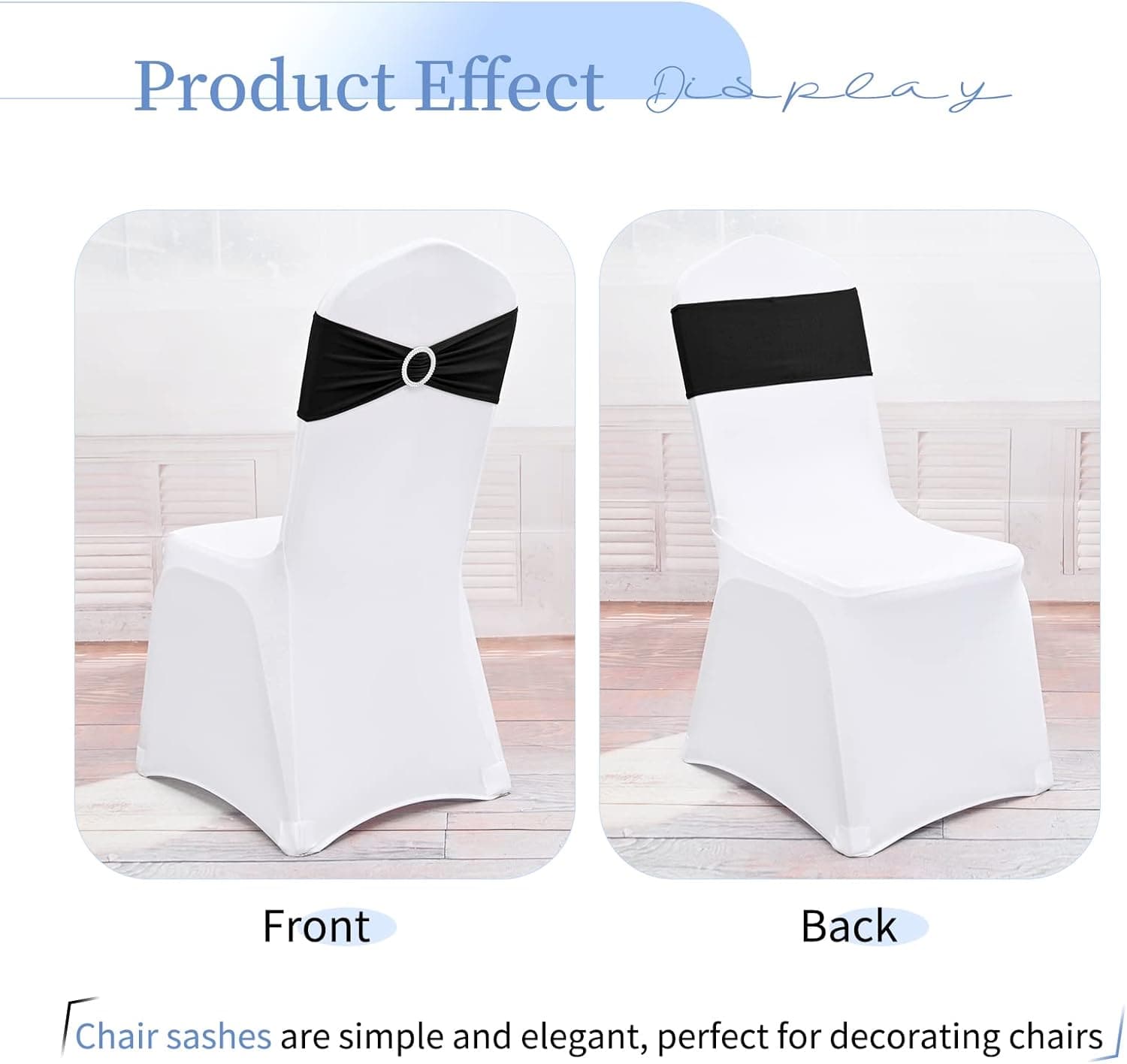 • High quality fabric: You will receive 60 pieces of chair sashes in black, Our Chair cover bands is made of high quality extra stretchy and sturdy spandex fabric (95% polyester and 5% spandex) and plastic buckle slider. These chair cover sashes are designed with good elasticity to stretch, which can help the chair sash fit the chair better and fits 13-19 inches of chair back width. Can provide a fashionable and modern appearance for weddings and banquet chairs.